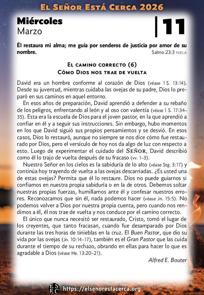 Nuestro Señor en los cielos es la sabiduría de lo alto (véase Stg. 3:17) y continúa hoy trayendo de vuelta a las ovejas descarriadas. ¿Es usted una de estas ovejas? Permita que él lo restaure. Dios no puede guiarnos si confiamos en nuestra propia sabiduría o en la de otros. Debemos soltar nuestras propias fuerzas, humillarnos ante él y confesar nuestros errores. Reconozcamos que sin él, nada podemos hacer (véase Jn. 15:5). No podemos volver a Dios por nuestra propia cuenta, pero cuando nos rendimos a él, él nos trae de vuelta y nos conduce por el camino correcto.