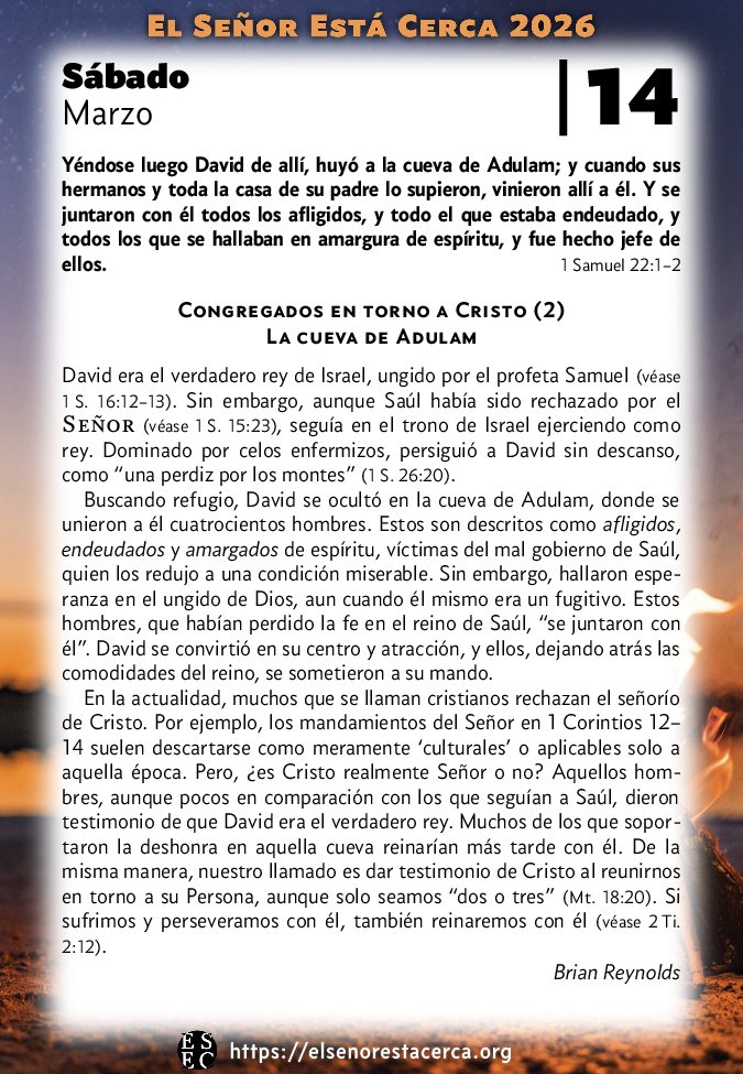 En la actualidad, muchos que se llaman cristianos rechazan el señorío de Cristo. Por ejemplo, los mandamientos del Señor en 1 Corintios 12–14 suelen descartarse como meramente ‘culturales’ o aplicables solo a aquella época. Pero, ¿es Cristo realmente Señor o no? Aquellos hombres, aunque pocos en comparación con los que seguían a Saúl, dieron testimonio de que David era el verdadero rey. Muchos de los que soportaron la deshonra en aquella cueva reinarían más tarde con él. De la misma manera, nuestro llamado es dar testimonio de Cristo al reunirnos en torno a su Persona, aunque solo seamos “dos o tres” (Mt. 18:20). Si sufrimos y perseveramos con él, también reinaremos con él (véase 2 Ti. 2:12).
