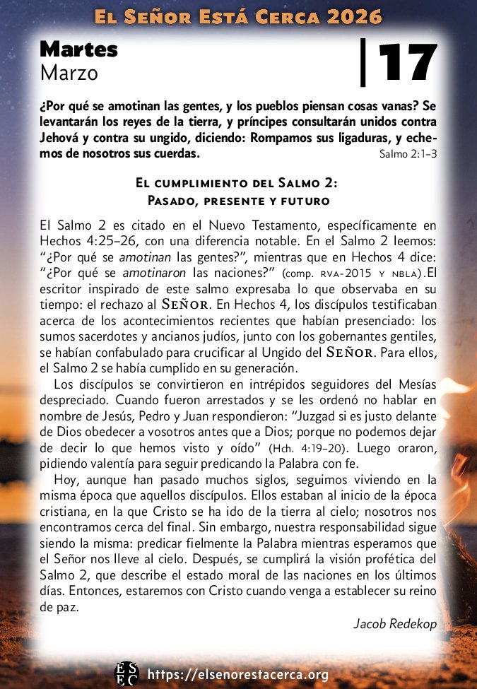 Hoy, aunque han pasado muchos siglos, seguimos viviendo en la misma época que aquellos discípulos. Ellos estaban al inicio de la época cristiana, en la que Cristo se ha ido de la tierra al cielo; nosotros nos encontramos cerca del final. Sin embargo, nuestra responsabilidad sigue siendo la misma: predicar fielmente la Palabra mientras esperamos que el Señor nos lleve al cielo. Después, se cumplirá la visión profética del Salmo 2, que describe el estado moral de las naciones en los últimos días. Entonces, estaremos con Cristo cuando venga a establecer su reino de paz.