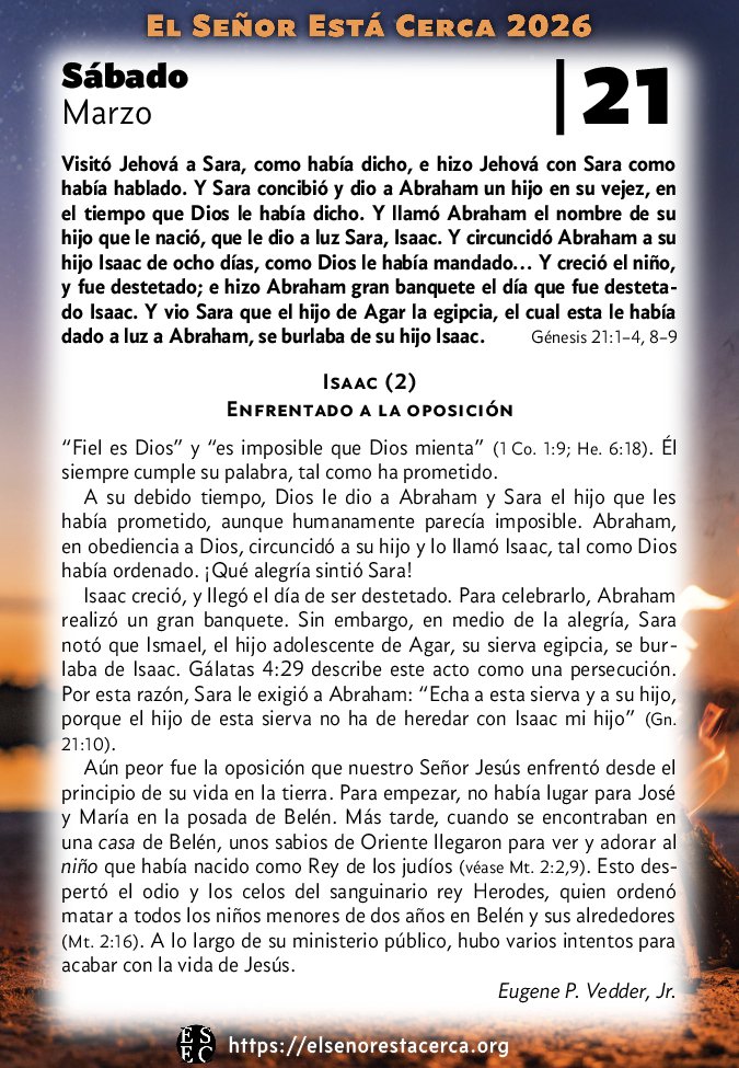 Visitó Jehová a Sara, como había dicho, e hizo Jehová con Sara como había hablado. Y Sara concibió y dio a Abraham un hijo en su vejez, en el tiempo que Dios le había dicho. Y llamó Abraham el nombre de su hijo que le nació, que le dio a luz Sara, Isaac. Y circuncidó Abraham a su hijo Isaac de ocho días, como Dios le había mandado… Y creció el niño, y fue destetado; e hizo Abraham gran banquete el día que fue destetado Isaac. Y vio Sara que el hijo de Agar la egipcia, el cual esta le había dado a luz a Abraham, se burlaba de su hijo Isaac. Génesis 21:1–4, 8–9