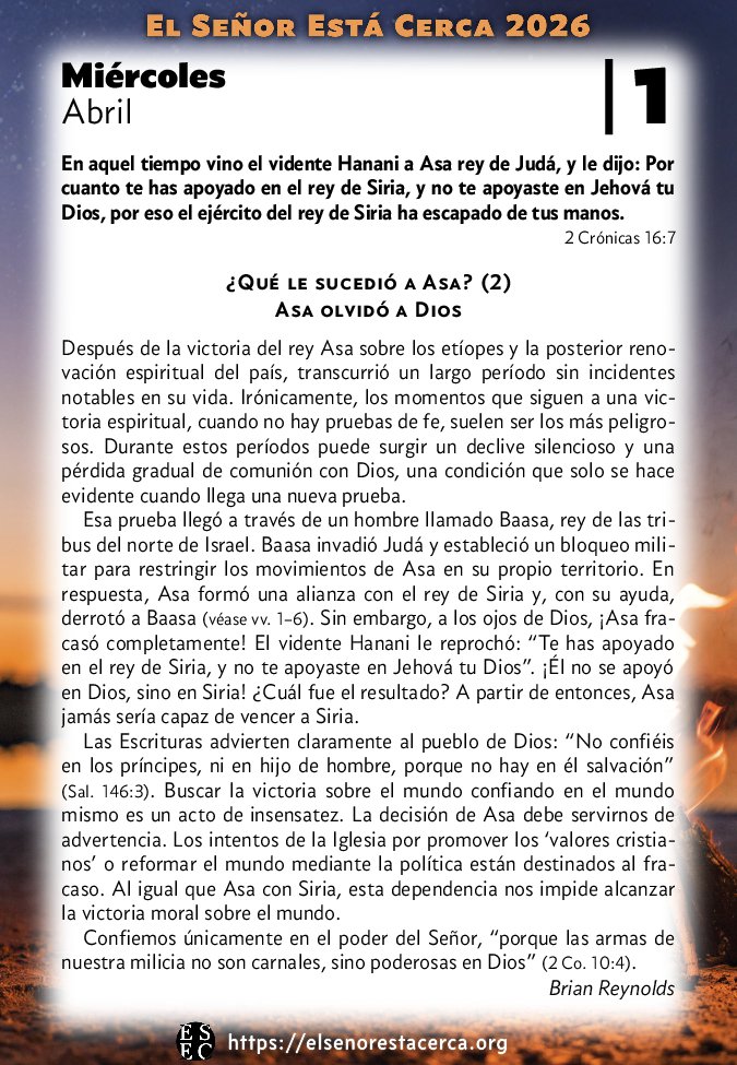 La decisión de Asa debe servirnos de advertencia. Los intentos de la Iglesia por promover los ‘valores cristianos’ o reformar el mundo mediante la política están destinados al fracaso. Al igual que Asa con Siria, esta dependencia nos impide alcanzar la victoria moral sobre el mundo.