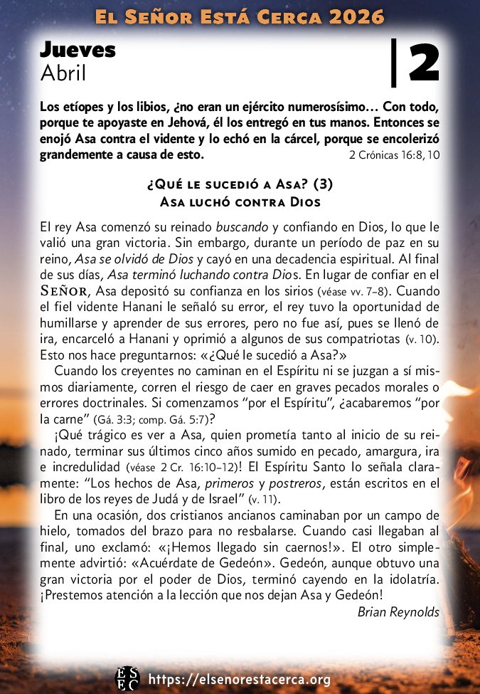El rey Asa comenzó su reinado buscando y confiando en Dios, lo que le valió una gran victoria. Sin embargo, durante un período de paz en su reino, Asa se olvidó de Dios y cayó en una decadencia espiritual. Al final de sus días, Asa terminó luchando contra Dios. En lugar de confiar en el Señor, Asa depositó su confianza en los sirios (véase vv. 7–8). Cuando el fiel vidente Hanani le señaló su error, el rey tuvo la oportunidad de humillarse y aprender de sus errores, pero no fue así, pues se llenó de ira, encarceló a Hanani y oprimió a algunos de sus compatriotas (v. 10). Esto nos hace preguntarnos: «¿Qué le sucedió a Asa?»