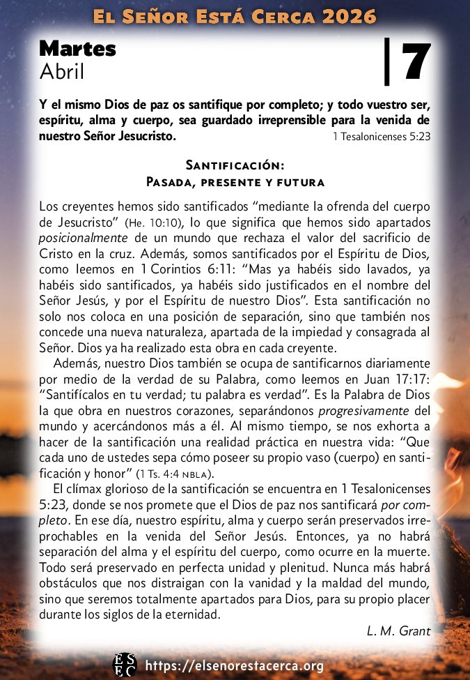 Además, nuestro Dios también se ocupa de santificarnos diariamente por medio de la verdad de su Palabra, como leemos en Juan 17:17: “Santifícalos en tu verdad; tu palabra es verdad”. Es la Palabra de Dios la que obra en nuestros corazones, separándonos progresivamente del mundo y acercándonos más a él. Al mismo tiempo, se nos exhorta a hacer de la santificación una realidad práctica en nuestra vida: “Que cada uno de ustedes sepa cómo poseer su propio vaso (cuerpo) en santificación y honor” (1 Ts. 4:4 nbla).