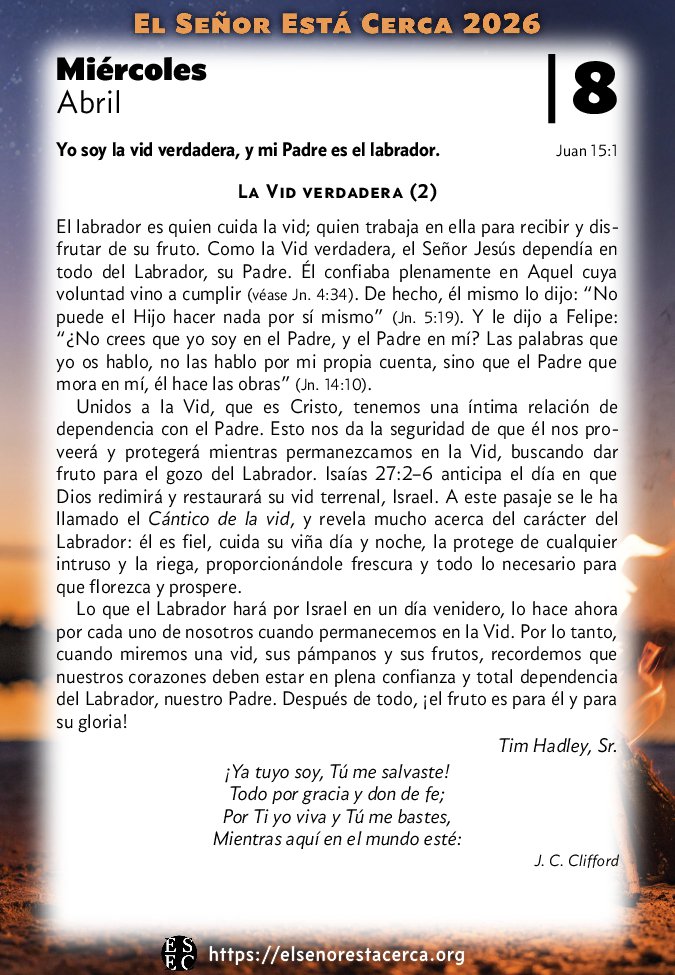Lo que el Labrador hará por Israel en un día venidero, lo hace ahora por cada uno de nosotros cuando permanecemos en la Vid. Por lo tanto, cuando miremos una vid, sus pámpanos y sus frutos, recordemos que nuestros corazones deben estar en plena confianza y total dependencia del Labrador, nuestro Padre. Después de todo, ¡el fruto es para él y para su gloria!