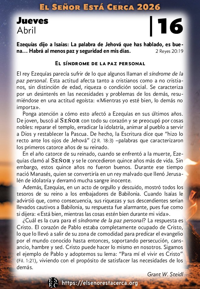 El rey Ezequías parecía sufrir de lo que algunos llaman el síndrome de la paz personal. Esta actitud afecta tanto a cristianos como a no cristianos, sin distinción de edad, riqueza o condición social. Se caracteriza por un desinterés en las necesidades y problemas de los demás, resumiéndose en una actitud egoísta: «Mientras yo esté bien, lo demás no importa».
