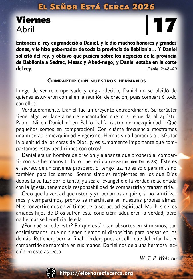 Verdaderamente, Daniel fue un creyente extraordinario. Su carácter tiene algo verdaderamente encantador que nos recuerda al apóstol Pablo. Ni en Daniel ni en Pablo había rastro de mezquindad. ¡Qué pequeños somos en comparación! Con cuánta frecuencia mostramos una miserable mezquindad y egoísmo. Hemos sido llamados a disfrutar la plenitud de las cosas de Dios, ¡y es sumamente importante que compartamos estas bendiciones con otros!